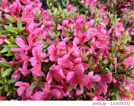 満開のピンク色のサツキツツジの花の群生
