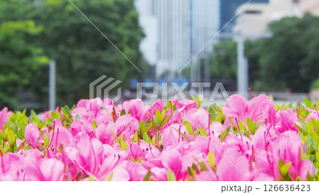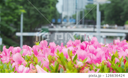 オフィス街を彩る満開のツツジ