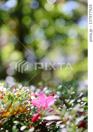 新緑に映えるピンクのツツジ_縦