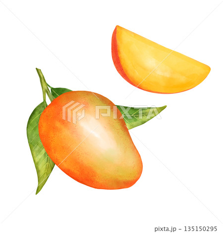 Hand-drawn illustration featuring a ripe whole mango, a bright yellow slice, and fresh green leaves. Perfect for tropical food branding, healthy eating themes, or refreshing drink advertisements