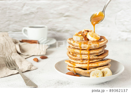 Wholegrain pancakes with banana and caramel sauce. Delicious breakfast.