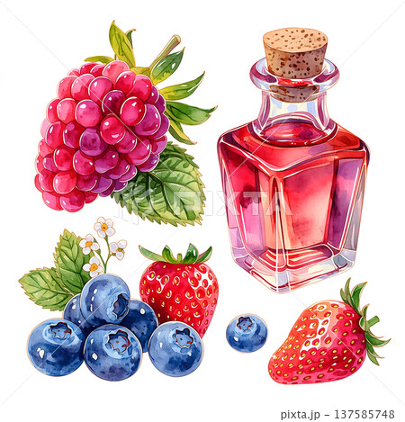 Mixed berries and a glass bottle of syrup with cork in a fresh arrangement on a white background during daytime