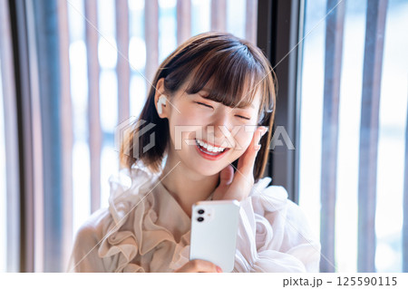 スマホで音楽を聴く若い女性