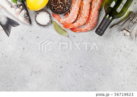 Fresh seafood. Trout fish and langostino shrimps