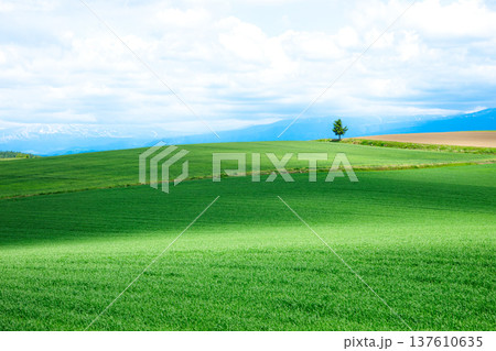青空と初夏の北海道美瑛町周辺の雄大な風景