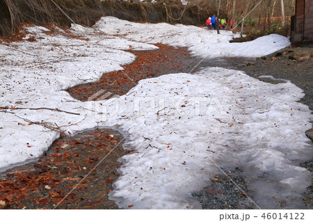 春の尾瀬沼付近の三平峠の残雪と木々の風景