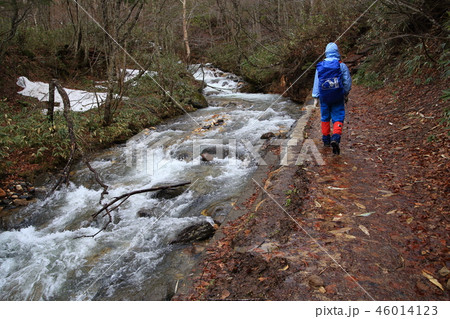 春の尾瀬 三平橋付近を過ぎた沢を尾根沼に向かって進むハイカー