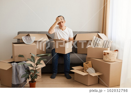 Indoor shot of sad upset man wearing white casual T-shirt and jeans, sitting on sofa, unpacking boxes after relocating, keeping hand on his head, looks tired.