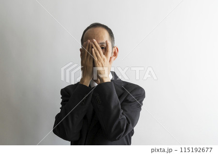 両手で顔を隠すて片目だけ覗くスーツ姿の日本人の中年男性