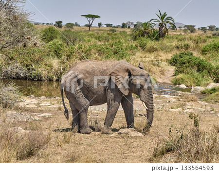 Large african elephant eating grass in natural habitat. Wildlife conservation