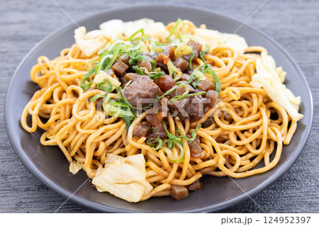 ぼっかけ焼きそば(牛スジ肉とこんにゃくの甘辛煮入り焼きそば)のアップ。