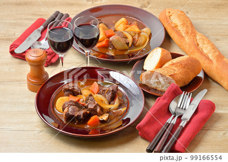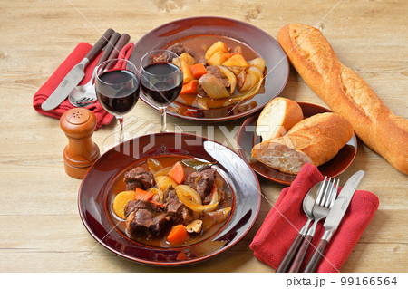 牛すね肉のビーフシチュー、牛スネ肉の煮込み、洋食シチュー。ディナー料理、二人分。バゲットを添えて。