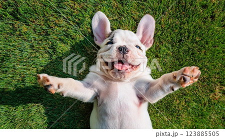 a happy French bulldog puppy lying on his back on the grass