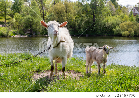 Goat on a rural farm close-up. A funny interested white goat without a horn peeks out from behind a wooden fence. The concept of farming and animal husbandry. Agriculture and dairy production.
