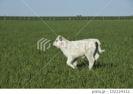 White Shorthorn calf , in Argentine countryside, La Pampa province, Patagonia, Argentina.