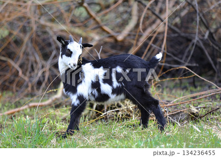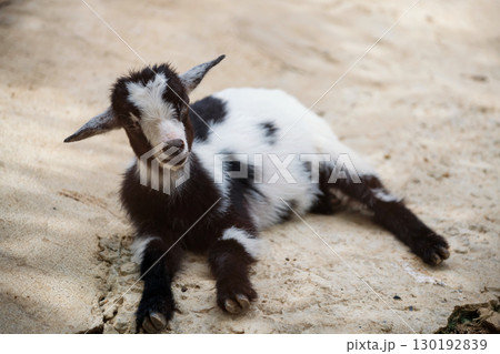 Cute smiling baby goat with black and white fur in zoo. farm animal
