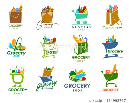 Grocery icons, food market, store, supermarket and shop signs. Vector shopping basket, cart and bag full of food products, fresh fruit, vegetables and bread isolated symbols set for grocery shop
