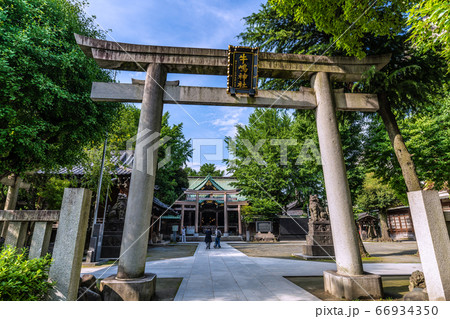 日本の東京都市景観 牛嶋神社の鳥居(奥に神社)などを望む