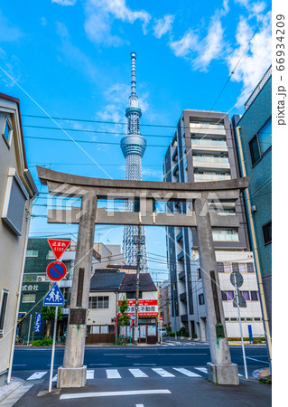 日本の東京都市景観 牛嶋神社の鳥居と東京スカイツリーなどを望む