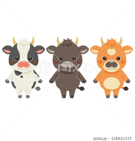 A Group Of Cows Standing Next To Each Other On A White Background. Farm cattle bulls. Different