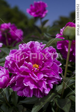 芍薬園に赤紫の芍薬(シャクヤク)の花が咲いています。