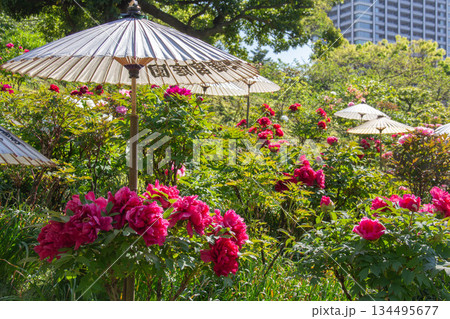 旧芝離宮恩賜庭園。和傘に彩られた4月の牡丹園