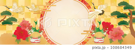 お正月和柄背景 金屏風と門松と鶴