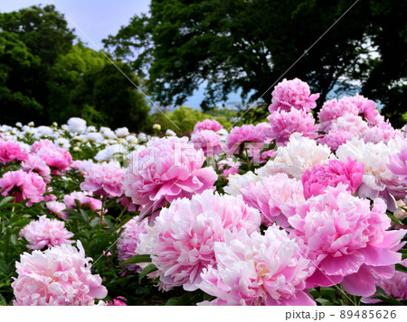 ゴールデンウイーク 茨城県つくば牡丹園に咲く満開のピンク色の芍薬の花の風景 イメージ
