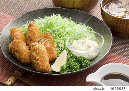 カキフライ(牡蠣フライ)タルタルソース添え。冬のシーフード海鮮料理。カキフライ定食。