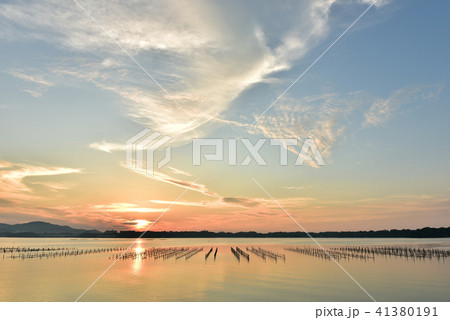 日の出前 オレンジ色の湖面 牡蠣棚