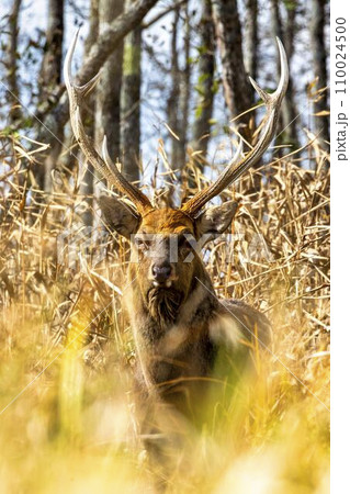 晩秋の釧路湿原 藪からこちらを見ているオスのエゾシカ 北海道釧路町