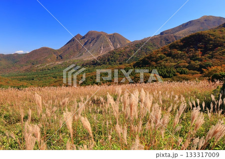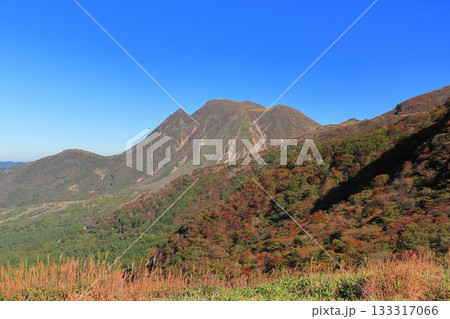 大分県のくじゅう連山、沓掛山付近の紅葉と猟師山、牧ノ戸峠