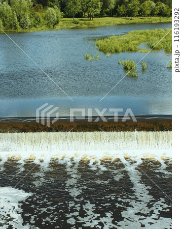 A tranquil river scene with a waterfall, lush greenery, and a serene atmosphere, perfect for relax.