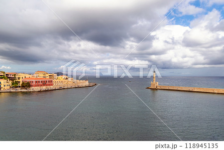 Landmarks of Crete - Panorama View of venetian port of Chania and lighthouse in old harbour of Chania, Greece.