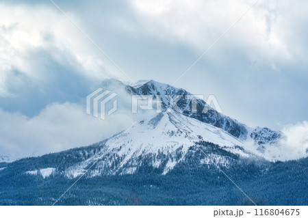 Majestic snowy rocky mountains with cloud flowing at countryside