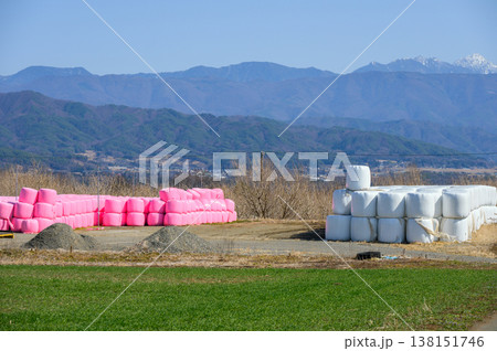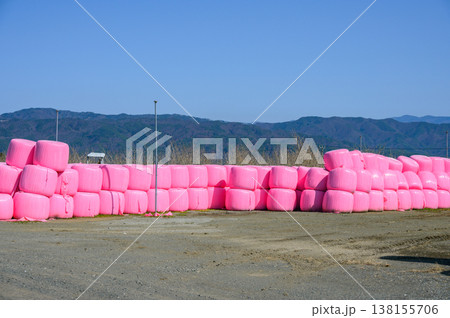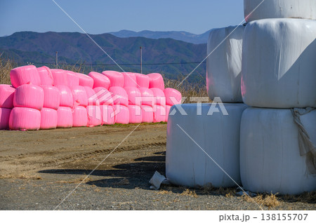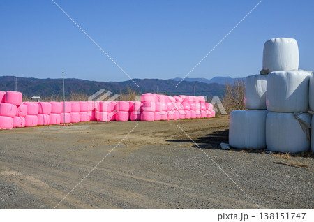 ピンク色と白色の牧草ロール【長野県】