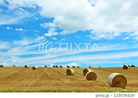 北海道 美瑛 夏の青空と牧草ロールの大地