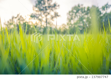 Idyllic green spring meadow with lush grass field, vibrant nature closeup, serene calm outdoor landscape, peaceful seasonal scenery