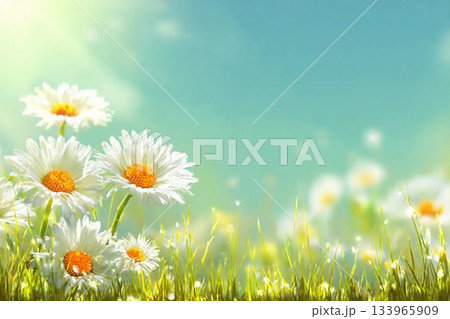 Spring background with grass, camomiles over blue sky