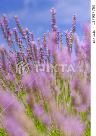 Dreamy lavender blossoms under bright blue sky, vibrant spring floral landscape, idyllic summer flowers nature background wallpaper