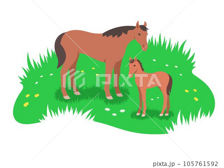 Brown horse and her little foal grasing in the green flower meadow. Simple flat stylized illustration