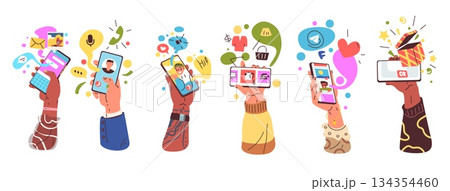 Hands use smartphone app. People hand hold cellphone with different mobile application, online order gift social media video call phone touch screen, classy vector illustration