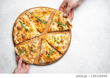 Hands taking slices of pizza