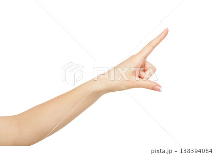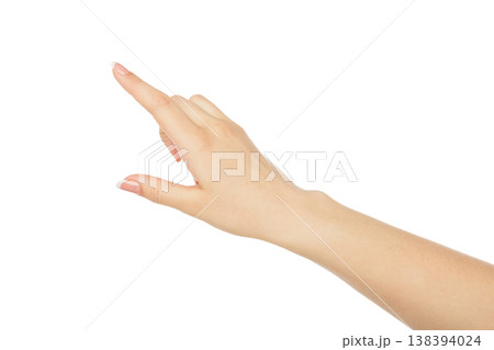 Woman's hand pointing on object with forefinger, close-up, cutout, isolated on white background.
