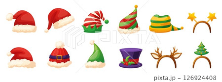 Christmas head accessories. Red santa hat, deer ears and horns, headband with xmas tree and stars. Elves hats with pom poms, nowaday vector set