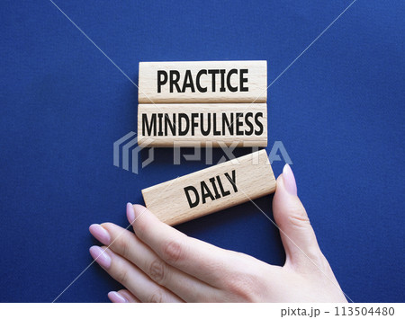 Practice Mindfulness Daily symbol. Concept words Practice Mindfulness Daily on wooden blocks. Businessman hand. Beautiful deep blue background. Medical and Psychology concept. Copy space.