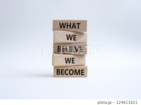What we Believe we Become symbol. Concept words What we Believe we Become on wooden blocks. Beautiful white background. Business concept. Copy space.