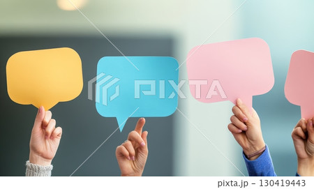 Hands holding vibrant, colorful speech bubbles filled with diverse opinions, questions, and messages, representing the essence of communication and meaningful dialogue