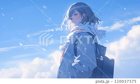 雪がちらつく空とこちらを見る女子高生(AI生成画像)