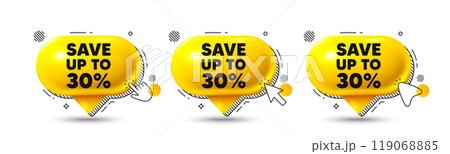 Chat speech bubble 3d icons. Save up to 30 percent tag. Discount Sale offer price sign. Special offer symbol. Discount chat offer. Speech bubble banners. Text box balloon. Vector